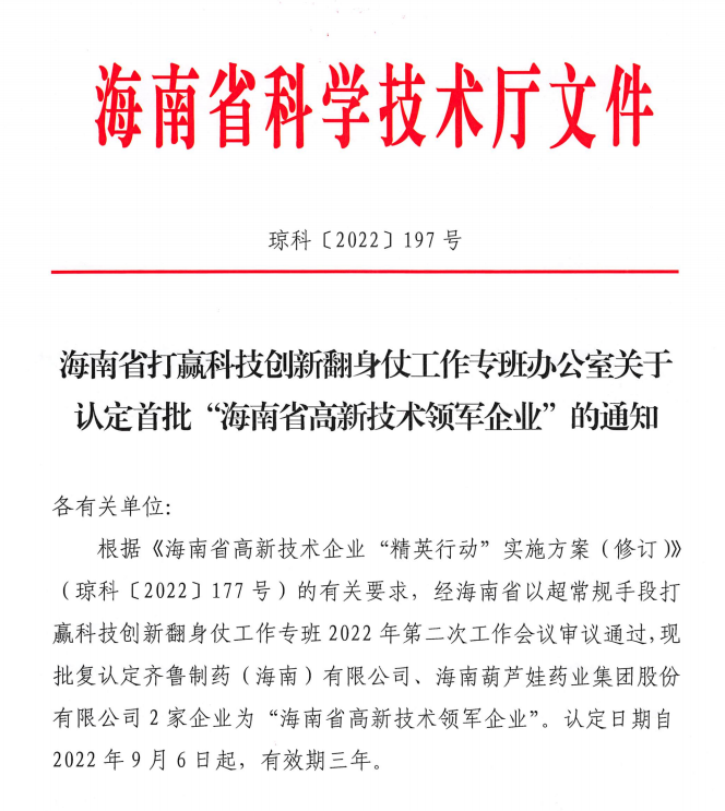近日,海南省科学技术厅发布的《海南省打赢科技创新翻身仗工作专班办公室关于认定首批“海南省高新技术领军企业”的通知》中显示,批复认定海南AG刮刮卡药业集团股份有限公司等2家企业为“海南省高新技术领军企业”。认定日期自2022年9月6日起,有效期三年。
