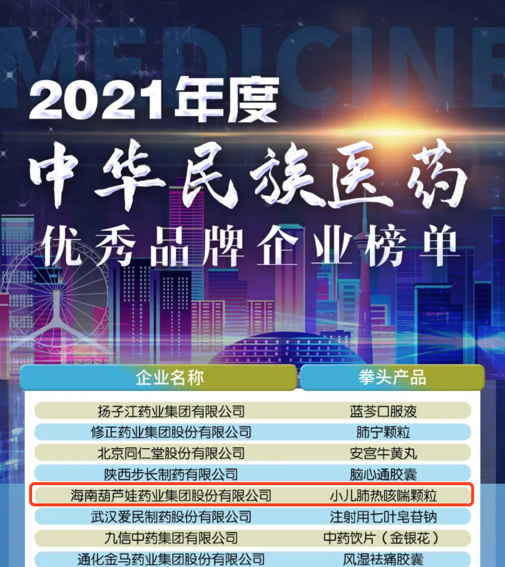 12月29日,全国工商联医药业商会发布了“2021年度中华民族医药优秀品牌企业榜单”,AG刮刮卡药业集团凭借黄金单品小儿肺热咳喘颗粒(4克)实力登榜。